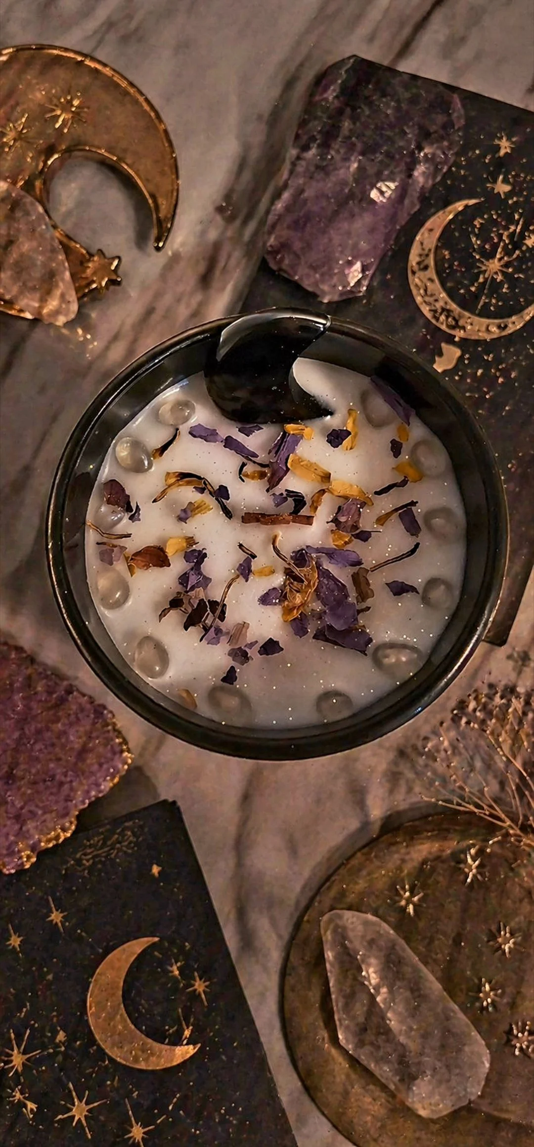 Infused with a crackling wooden wick, luminous angel aura quartz, and sacred Egyptian blue lotus—each element is chosen to deepen your spiritual connection, heighten intuition, and open a gentle pathway to ancestral wisdom and guiding energies in the spirit realm.